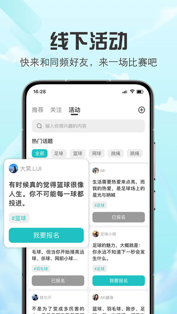 活动发布与报名:支持发布线下运动活动,设置时间、地点、人数限制,其他用户可在线报名参与。