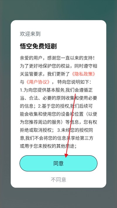 1. 下载安装《悟空看短剧》APP,打开应用后,首先阅读并同意隐私协议,完成协议确认后进入软件主界面。