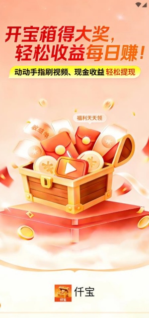 仟宝app是款将短视频内容与广告任务相结合的娱乐网赚平台,除了常规的赚钱任务方式外,还增加了开启宝箱的玩法,提高其娱乐性,同时还能为用户提供更多的实在收益,通过绑定账号快速提现。