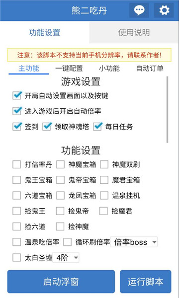 功能配置:进入游戏后,呼出悬浮窗。在功能设置界面,根据需求勾选“主功能”或“小功能”下的具体选项,如自动设置、特定战斗逻辑等。