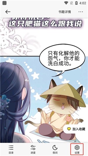 2. 进入漫画阅读界面后,点击屏幕任意位置,调出功能按键,功能栏中包含目录、阅读进度、夜间模式和设置功能,点击「设置」键。