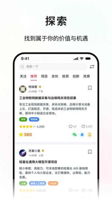 专门的“探索”板块汇聚了海量行业机遇与合作需求,用户可在此发掘项目、寻找资源或展示自身技能,实现供需对接。
