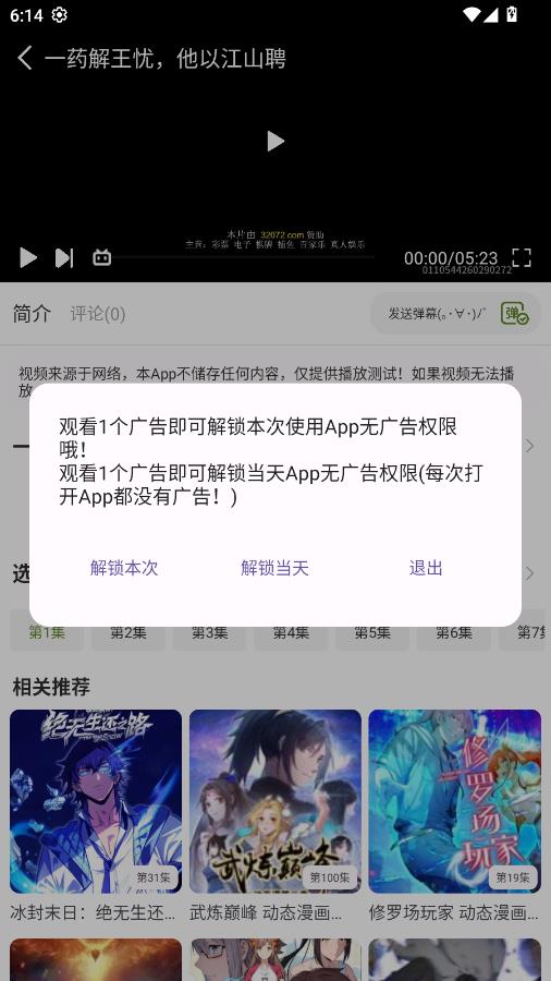 选择喜欢的进入播放页面,可以看到提示,选择解锁本次或者当天。