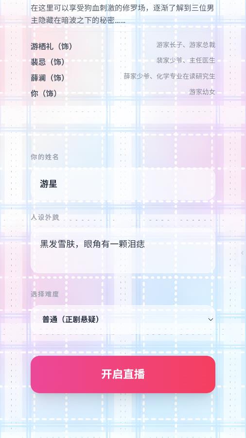 然后选择难度和自己的人物设定,点击开启直播即可体验了。