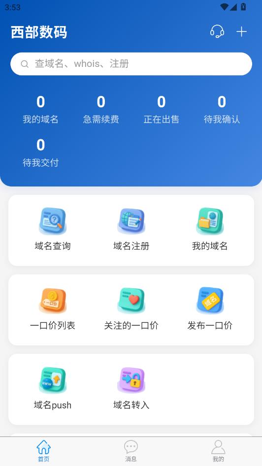 西部数码app是款专注于域名的服务平台,覆盖注册、续费、转入转出以及日常管理等功能,都可以通过它一站式完成,并且集成线上交易功能,满足用户的交易需求,实现域名资产的价值最大化。