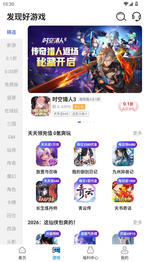 1氪游戏玩爆app是款聚合海量热门手游资源的盒子软件,包括三国、传奇、仙侠、卡牌等众多类型,提供高效稳定的下载渠道,并且拥有超低折扣充值优惠,最低至0.01折哦!同时还有超多福利可以领取。