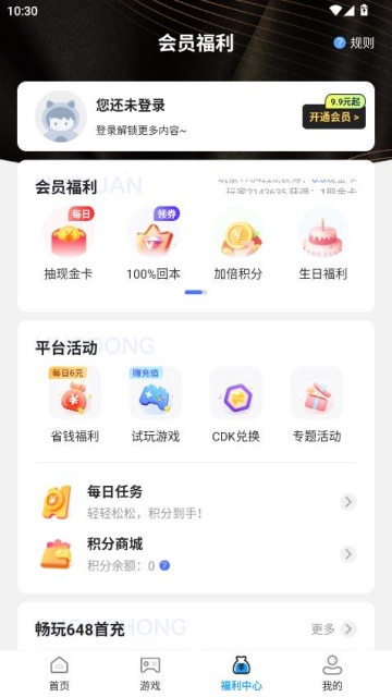 个人中心:用户可以管理个人信息、查看收藏的游戏、管理“我的游戏”以及查看福利领取记录。
