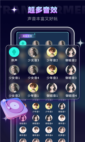 语音变声:选择心仪的音色(如萝莉、大叔),可直接开始录音,实时听到变声效果。