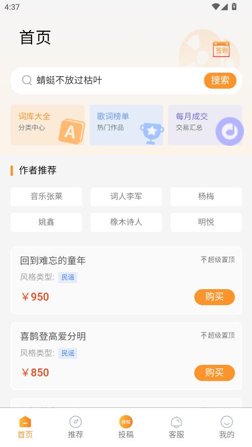 买家可以通过风格、价格、热度等多维度筛选歌词作品,快速定位到自己心仪的创作素材。