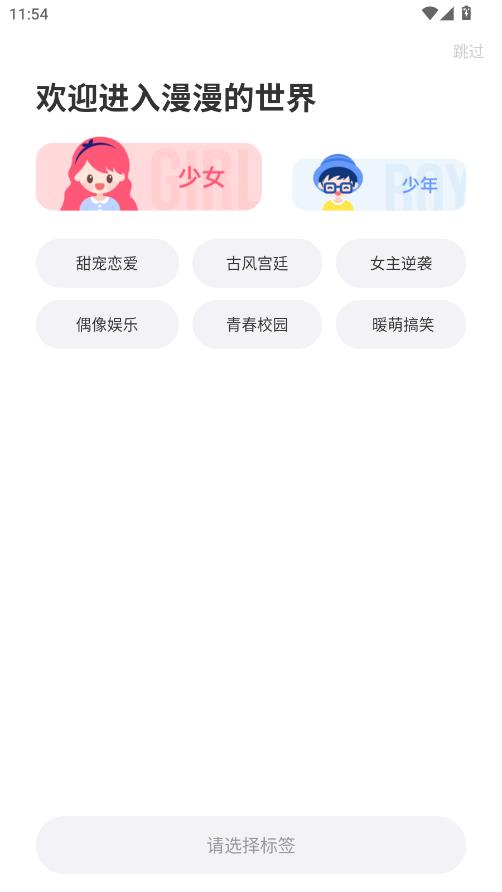 如果是首次使用该软件进入时可以选择喜欢的标签,方便系统推荐类似热门漫画作品。