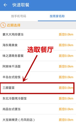用户根据商家名称和距离选择离自己最近的商家。