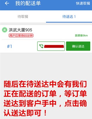 1、用户可以点击待送达查看自己未配送的订单,将订单送到客户手中后即可点击确认送达。