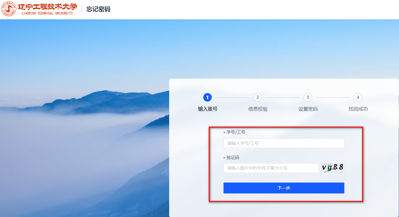 3.输入学号/工号、验证码,点击下一步。然后按照系统的提示操作即可找回密码。(由于小编不是本校在读大学生也不是在职教职工没有学号和工号,所以后面的截图不了)