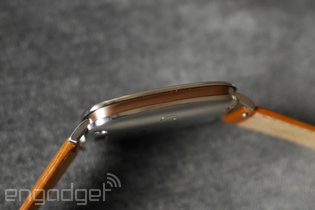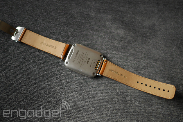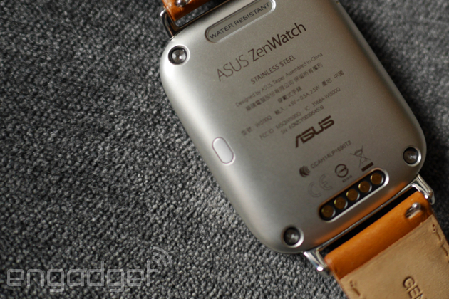 ZenWatch 有唯一的一颗硬件按键(上图正中央那个药丸形的部份),单按是睡眠/唤醒,长按是系统菜单。但很显然地,华硕根本不想要你按这颗按键 -- 不仅它的位置在底面的一侧,不把手表拿下来基本上按不到,而且这颗按键又小又硬,还和底部完全齐平,要用指甲尖用力戳才按得下去。是说,一般使用确实是不太用得到这颗实体按键,反正转一下手腕也能唤醒、手盖在表面上可以强迫睡眠(其实不强迫它 ZenWatch 也一下就去睡了...)、唯一就是长按才能叫出的重启和蓝芽连线等功能菜单是个麻烦,还好用到的机会也很小就是了。其实以 ZenWatch 比较典雅、低调的设计,在侧面像 Moto 360 那样加一颗按键应该也不会太破坏外型,但显然华硕的设计师这次很坚持要把按键藏好就是了.