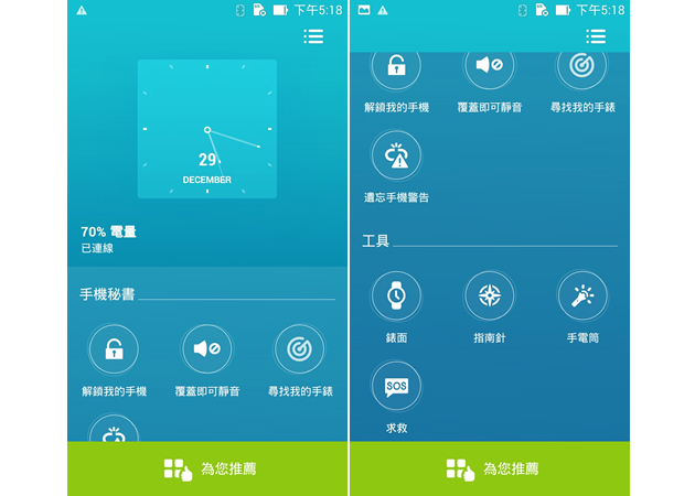 其他工具都是启动手表上的功能,像指南针、手电筒(长亮或闪烁白/红屏幕)、求救(发讯息给紧急联系人)等。底下自然还有一个推荐 App 的按键,但里面除了 Asus 自家的东西外,只有 Jawbone 的 UP 和 Omlet 第三方的 App。