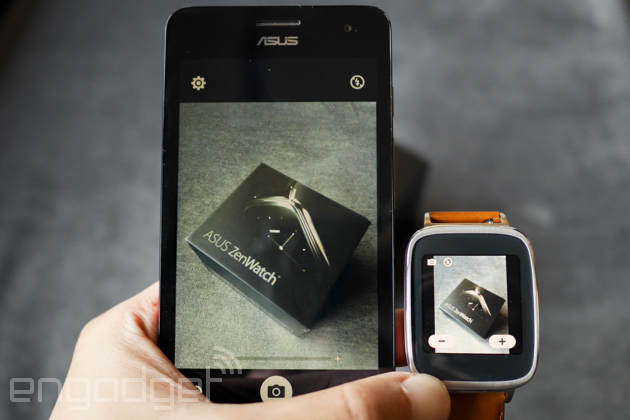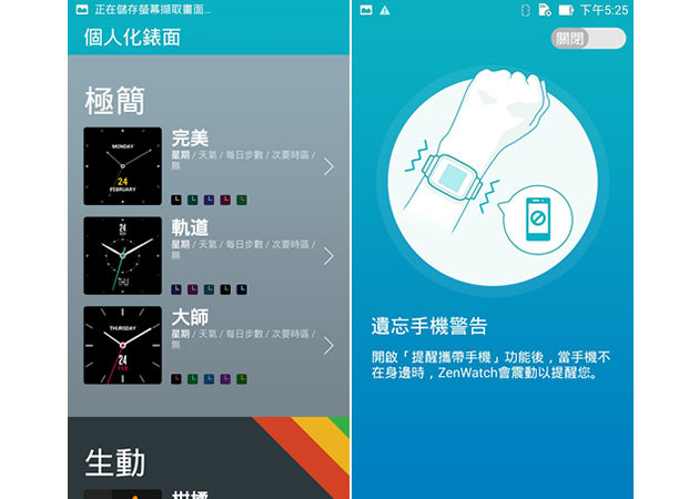 华硕最特别的一个功能「遥控相机」,是以独立的 App 的形式存在于 ZenWatch Manager 之外的。这个叫 Remote Camera 的 App 本身就是个很普通的相机软件,但一打开它就会自动启动 ZenWatch 相对应的 App,让你可以在手表上看到与手机镜头相同的画面。华硕的解说是说这个功能让你可以用主相机自拍的时候,看到拍摄的画面取景,一切都准备好了之后,转动一下手腕就会拍下去了。实际操作起来是非常地简单而直觉,完全不用做什么特别的设定,只是在前置相机愈来愈强大的今天,或许这个功能也少数的特定场合才有用了吧。