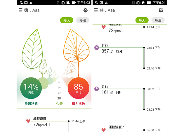 最后,健康相关的功能是必不可少的,除了计步器之外,ZenWatch 的心跳计是做在正面左右两侧的边框上,量测的时候会叫你把两只手指压在表面上进行。这种量测方式的准确性只能说...有待商榷 -- 小编坐在咖啡店里,附近也没有正妹的情况下,心跳量出了 152bpm 的数字,一分钟后再量掉到了 60bpm,再一分钟后又回升到了 145bpm -- 所以,大概参考一下就好了。至于专用的 Wellness app,则是整合了计步器和心跳的信息,可以看到少部份的计步历史,以及从心跳数字计算出来的「放松度」。更详细的信息,要回到手机上对应的 Wellness App 上才会看到,这里纪录了一整天下来所有的运动和量测信息。